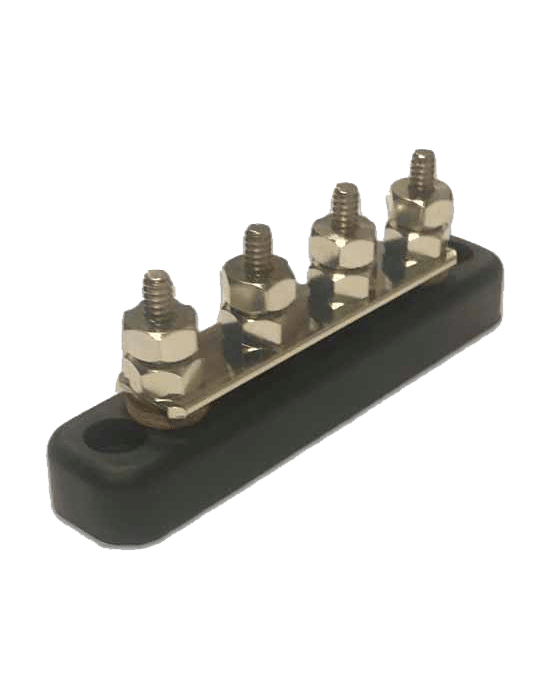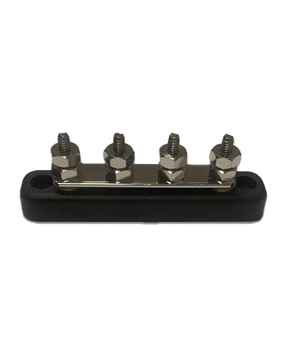 100A rated busbar / terminal block with four 5mm stud terminals for distributing power. All connections have locking washers and the busbar can be secured via the two molded mounting holes.