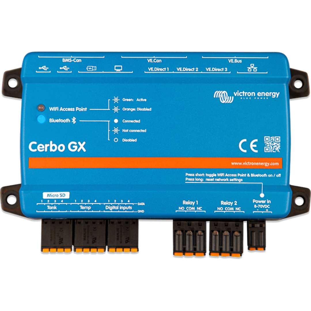 This all-new communication-center allows you to always have perfect control over your Victron system from wherever you are and maximizes its performance. Simply connect through the VRM portal, or access directly, using the separate GX Touch or VictronConnect App thanks to its added Bluetooth capability. This latest addition to the GX-range combines all the best of connectivity, redefining smart power solutions in every way.